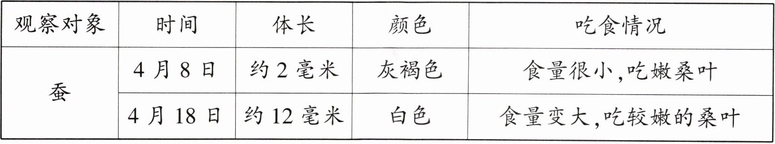 六、请你根据下面的观察记录表,写出观察对象——蚕的一个方面的生长变化。