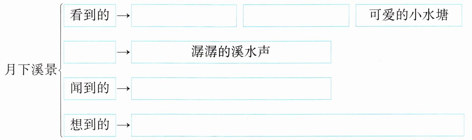 1.山草和野花的香味 月光 鹅卵石 2.示例:细细的溪水 灰白色的鹅卵石 听到的山草和野花的香味 阿妈白天洗衣裳,“我”用树叶做小船运花瓣 3.拟人 小水塘 月亮 4.示例:在溪边洗菜、淘米 卷起裤腿,在溪水里捉鱼摸虾 5.A