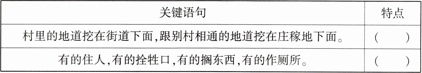 ,这也正是地道战取得成功的关键。2. 用较快的速度默读课文,找关键句,完成表格。