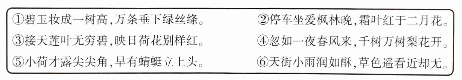 七、五年级(1)班打算制作一本“四时之美”的古诗集,请你帮岳涵把积累的诗句进行分类。(填序号)