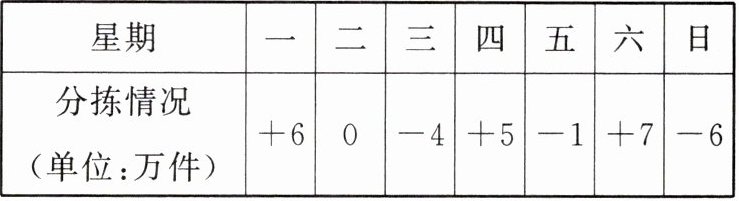 (2)解:$\frac{1}{7}×[(6+0-4+5-1+7-6)+20×7]=\frac{1}{7}×[7+20×7]=\frac{1}{7}×147=21$(万件).答:该仓库本周实际平均每天分拣21万件包裹.