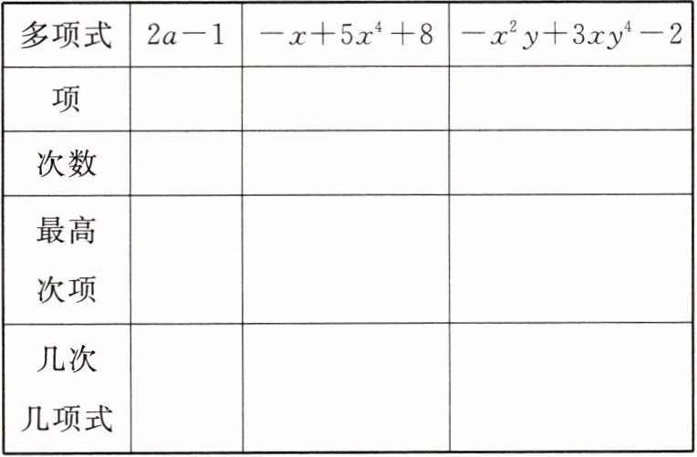 2a,-1 -x,5x⁴,8 -x²y,3xy⁴,-2 1 4 5 2a 5x⁴ 3xy⁴ 一次二项式 四次三项式 五次三项式