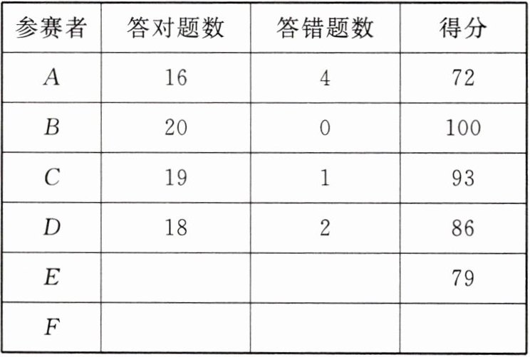 (3)不可能.理由如下:设参赛者F答对了n道题,则答错了(20-n)道题.依题意,得5n-2(20-n)=90,解得n=130/7.因为n不为整数,所以n=130/7不符合实际情况,即参赛者F的成绩不可能为90分.