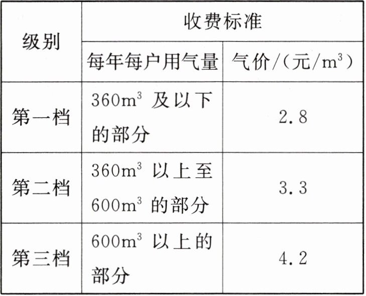 9. 某市民用天然气气价根据每年每户用气量分为三个档次,具体收费标准如下表: