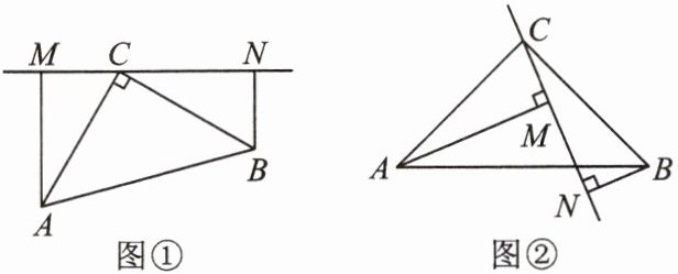13. 【类比探究】如图①,在△ABC中,∠ACB = 90°,AC = BC,过点C在△ABC外作直线MN,AM⊥MN于点M,BN⊥MN于点N。
