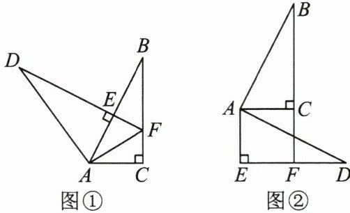 (2)类比探究:如图②,$AB = AD$,$AC = AE$,$∠ACB = ∠AED = 90^{\circ}$,延长$BC交DE于点F$,写出$DF$,$BC$,$CF$之间的数量关系,并证明你的结论。