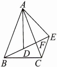 3. (贵州省中考改编)如图,已知$AB = AC$,$AD = AE$,$BD = CE$,$B$,$D$,$E$三点共线,$AC与BE相交于点F$,请从下列结论:①$\angle ADE = \angle CAE + \angle ACE$;②$\angle BAC = \angle BEC$,选择一个进行证明.