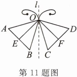 11. (福建省中考)小明用两个全等的等腰三角形设计了一个“蝴蝶”的平面图案,如图。其中$\triangle OAB与\triangle ODC$都是等腰三角形,且它们关于直线$l$对称,点$E$,$F分别是底边AB$,$CD$的中点,$OE\perp OF$。下列推断错误的是(