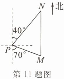11. 【原创题】如图,一艘海轮位于灯塔$P的南偏东70^{\circ}方向的点M$处,它以$40海里/h$的速度向正北方向航行,$2h后到达位于灯塔P的北偏东40^{\circ}方向的点N$处,则点$N处与灯塔P$的距离为