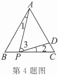 4. 如图,在等边三角形ABC中,P为BC上一点,且∠1= ∠2,则∠3的度数是