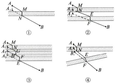 [思考]如图②所示,从A到B的路径AMNEFB最短.[进一步思考]如图③所示,从A到B的路径AMNGHFEB最短.[拓展]如图④所示,从A到B的路径AMNEFB最短.