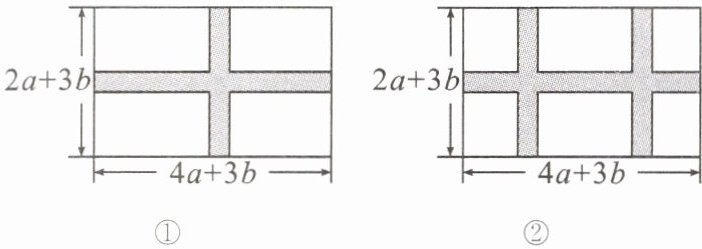 16. 【数学与生活】如图①,在某住房小区的建设中,为了业主的宜居环境,小区准备在一个长为$(4a + 3b)$m,宽为$(2a + 3b)$m 的长方形草坪上修建一横一竖、宽度均为$b$m 的通道.