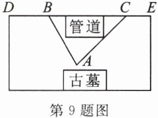 9.【新考法】如图,考古学家发现在地下$A$处有一座古墓,古墓上方是燃气管道,为了不影响管道,准备在$B处和C$处开工挖出“V”字形通道。若$\angle DBA = 120^{\circ}$,$\angle ECA = 135^{\circ}$,则$\angle A$的度数是