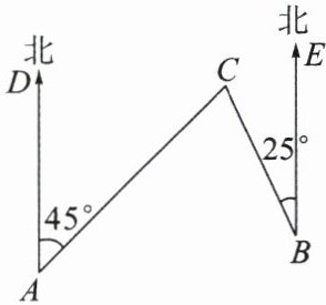10.(教材第12页例2变式)如图,$C岛在A岛的北偏东45^{\circ}$方向,在$B岛的北偏西25^{\circ}$方向,求从$C岛看A$,$B两岛的视角\angle ACB$的度数。