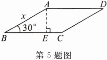 5. 如图,已知 $ □ABCD $ 的周长为 8cm,$ ∠B = 30^{\circ} $,若边长 $ AB = xcm $,过点 A 作 $ AE ⊥ BC $ 于点 E。