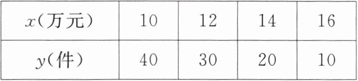 (1)解:由表可知 y 是 x 的一次函数,设 y=kx+b,将(10,40),(12,30)代入,得$\left\{\begin{array}{l} 10k+b=40,\\ 12k+b=30,\end{array}\right. $解得$\left\{\begin{array}{l} k=-5,\\ b=90,\end{array}\right. $