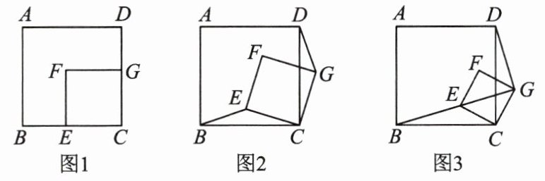 (3)若$AB = 5\sqrt{2},CE = \sqrt{2},$将(1)中正方形CEFG绕点C旋转$\alpha$度$(0 < \alpha < 90),$当B,E,G三点在一条直线上(如图3)时,求DG的长。