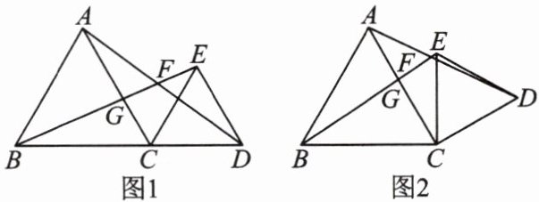 1. 如图,$\triangle ABC和\triangle CDE$都是等边三角形,$AD和BE交于点F$。