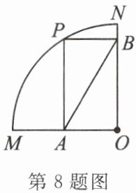 8. 如图,矩形 $ PAOB $ 的顶点 $ P $ 在弧 $ MN $ 上,且不与 $ M $,$ N $ 重合,顶点 $ A $,$ B $ 分别在线段 $ OM $,$ ON $ 上。当 $ P $ 点在弧 $ MN $ 上移动时,矩形 $ PAOB $ 的形状,大小随之变化,则 $ AB $ 的长度(