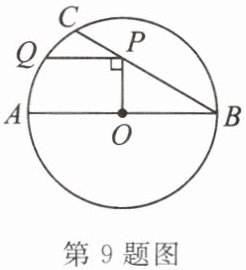 9. 如图,在 $ \odot O $ 中,直径 $ AB = 6 $,$ BC $ 是弦,$ \angle ABC = 30^{\circ} $,点 $ P $ 在 $ BC $ 上,点 $ Q $ 在 $ \odot O $ 上,且 $ OP \perp PQ $。当 $ PQ // AB $ 时,$ PQ $ 的长为