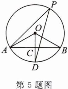 5. (湖州市中考)如图,已知 $AB$ 是$\odot O$的弦,$\angle AOB = 120^{\circ}$,$OC\perp AB$,垂足为 $C$,$OC$ 的延长线交$\odot O$于点 $D$。若$\angle APD是\overgroup{AD}$所对的圆周角,则$\angle APD$的度数是