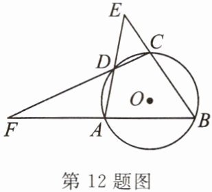 12. (原创题)如图,四边形 $ABCD$ 是$\odot O$的内接四边形,$AD$ 与 $BC$ 的延长线交于点 $E$,$BA$ 与 $CD$ 的延长线交于点 $F$。若$\angle DCE = 80^{\circ}$,$\angle F = 25^{\circ}$,则$\angle E = $