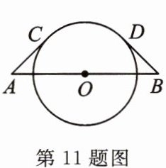 11. 如图,线段AB经过$\odot O$的圆心,AC,BD分别与$\odot O$相切于点C,D. 若$AC = BD = 4,\angle A = 45^{\circ},$则$\overset{\frown}{CD}$的长度为(