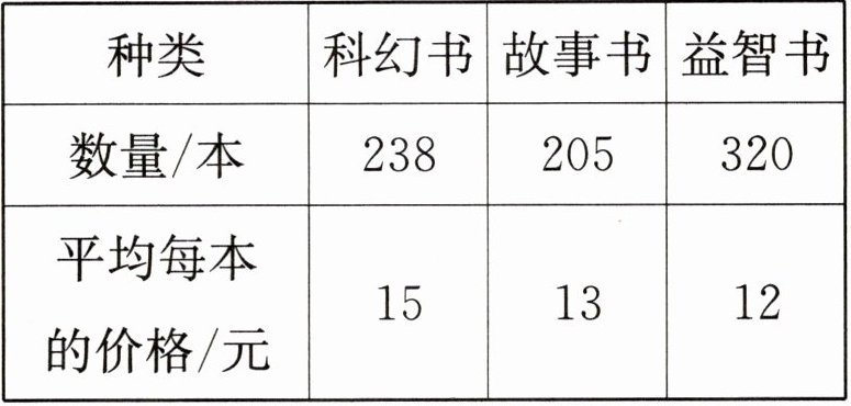 (1)科幻书:238×15=3570(元) 故事书:205×13=2665(元) 益智书:320×12=3840(元)