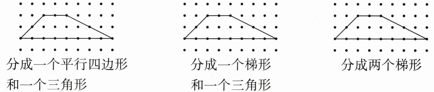 ② 从梯形上底(非顶点)的一点向底边引垂线段(或与底边相交的线段),可分成一个梯形和一个三角形(中图:从上底左数第二个点向下作与底边相交的线段);