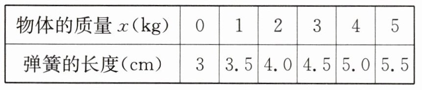 (1)弹簧不挂物体时长度为3cm,当所挂物体质量每增加1kg,弹簧长度就增加0.5cm。弹簧的长度=3+0.5x