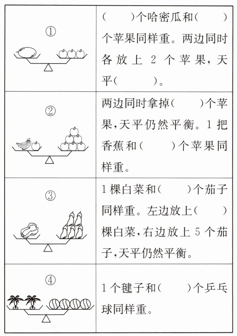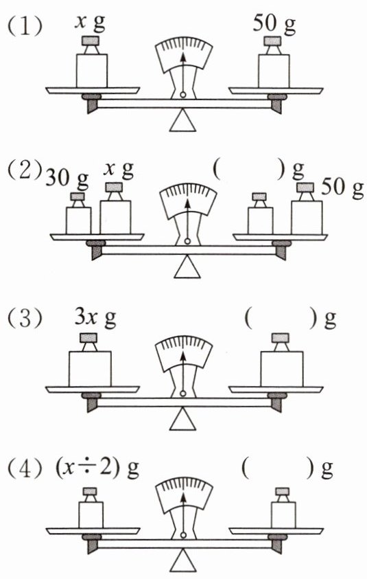 4. 根据图(1)中天平平衡时 x 的值,在下面每幅图中右边天平的括号里填上适当的数字,使天平平衡。
