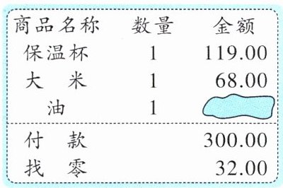 4. 下面是一张王阿姨在超市购物的小票,有一处看不清楚。你能帮王阿姨算一算油的价钱吗?