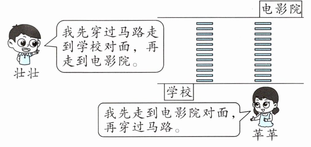 四、壮壮、苹苹要从学校步行到对面的电影院。他们谁走的路程较短?为什么?