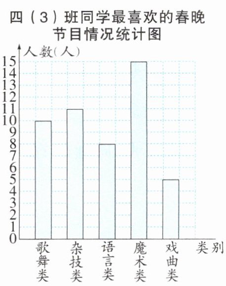 1. 如图是实验小学四(3)班同学最喜欢的春晚节目情况统计图。