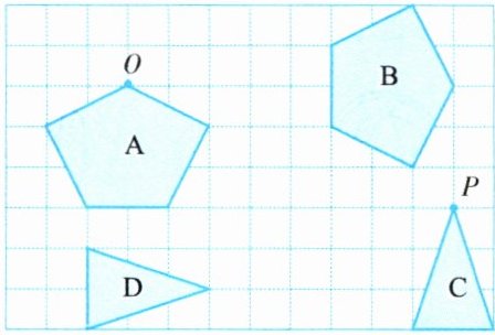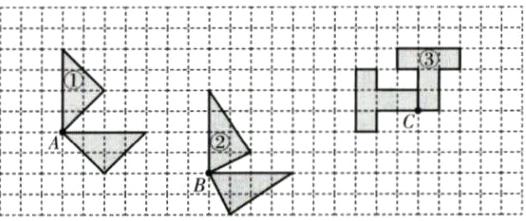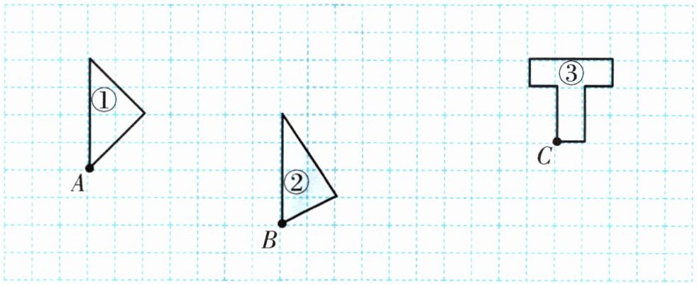 4. 将左下边的图形向右平移1格,再向上平移1格。将最右边的图形绕它左下角的顶点沿逆时针方向旋转90°。