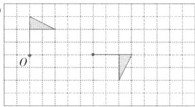 (1) 将小旗绕点 O 沿顺时针方向旋转 $ 90° $,再向右平移 5 格。