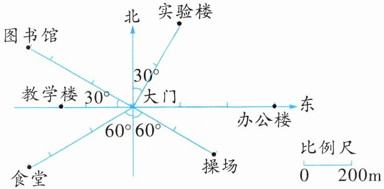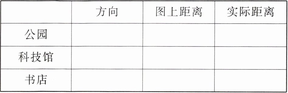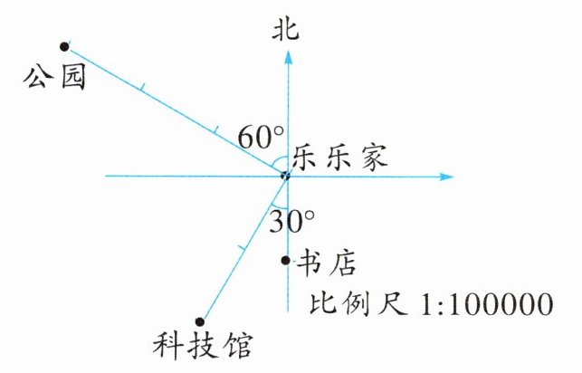 2. 以乐乐家为参照点,根据图上距离和所标注的角度填空。