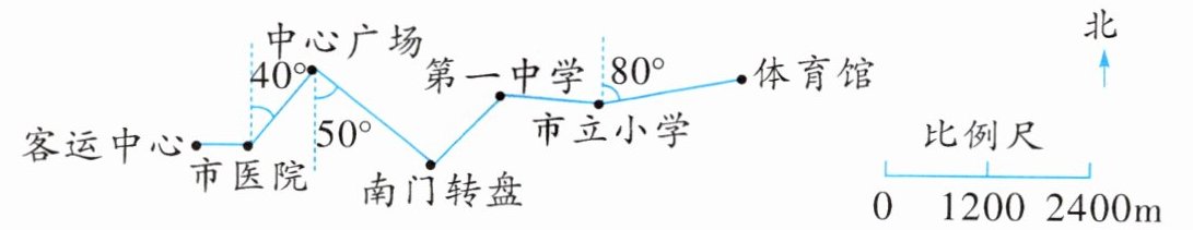 3. 8 路车从体育馆返回客运中心,在中心广场沿着( )( )°方向行驶( )km 到达市医院。