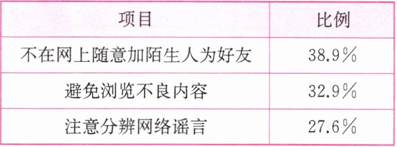 4.D 解析:本题考查合理使用网络。表格反映出青少年在网络使用中对信息的辨别能力和风险防范意识较为薄弱,D项符合题意;深入开展网络环境专项整治行动不是青少年的行为,A项不符合题意;表格中并未直接体现青少年存在沉迷网络的问题,也没有涉及学会"信息节食",B项不符合题意;题干强调的是青少年在网络安全意识方面的不足,而非利用网络交友,C项不符合题意。