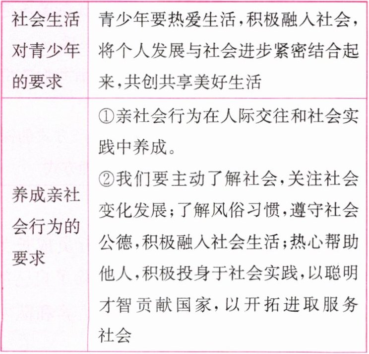 2.A 解析:本题考查亲社会行为的重要性。分析材料可知,中学生通过用身边的材料做实验、行走大好河山等活动,培育科学精神,了解国情民情,感受时代脉搏,①正确;参与各种丰富多样的活动,有助于中学生拓展视野、锻炼能力、丰富情感体验,从而塑造健全人格,不断完善自我,③符合题意;承担家务劳动的目的不是赚取劳动报酬,②说法错误;中学生体验不同职业,主要是为了增加对职业的了解,促进自身的成长,而不是引领社会风尚,④说法错误。