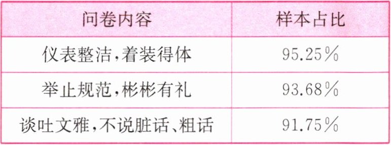 B 解析:本题考查文明有礼。题干中的问卷内容都属于文明有礼的表现,根据调查结果可以看出大部分同学能做到以礼待人,B项正确;题干没有体现平等待人、欣赏他人、关注他人,排除A、C、D三项。