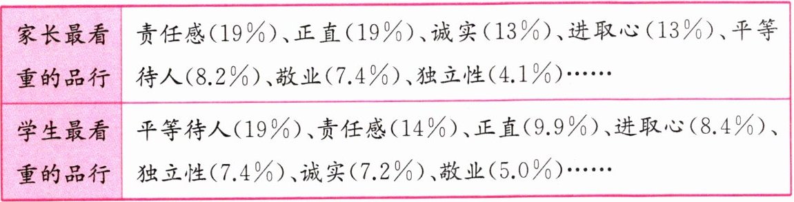 下表是关于家长和学生心目中“未来社会最应该倡导的品行”的调查,调查结果如下。