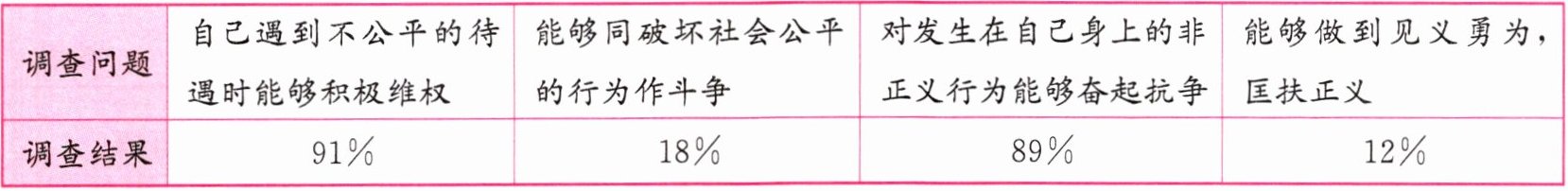 |调查问题|自己遇到不公平的待遇时能够积极维权|能够同破坏社会公平的行为作斗争|对发生在自己身上的非正义行为能够奋起抗争|能够做到见义勇为,匡扶正义|