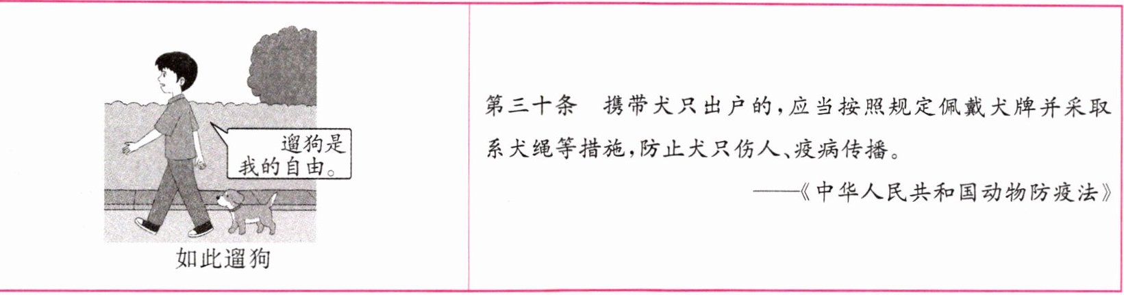 (1)①漫画中遛狗者的言行是错误的。②自由意味着在遵守道德、纪律、法律等社会规则的前提下,人们能够依照自己的意志活动,在思想、言论和行为等方面具有充分的自主性,拥有广阔的发展空间。③漫画中遛狗者有遛狗的自由,但自由不是随心所欲,它是有限制的、相对的。我们要在遵守道德、纪律、法律等社会规则的前提下行使权利。因此,漫画中的遛狗者应文明养犬,尊重他人权利,遵守养犬规定,遛狗拴绳。