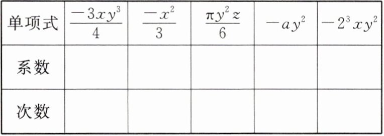 系数:-$\frac{3}{4}$;$-\frac{1}{3}$;$\frac{\pi}{6}$;-1;-8 次数:4;2;3;3;3