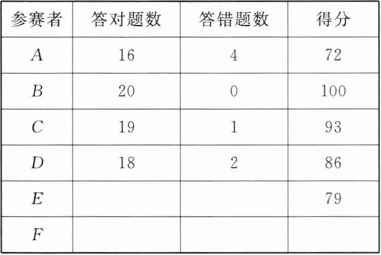(3)不可能.理由如下:设参赛者 F 答对了 n 道题,则答错了(20 -n)道题.依题意,得 5n -2(20 -n)=90,解得$n=\frac{130}{7}$.因为 n 不为整数,所以$n=\frac{130}{7}$不符合实际情况,即参赛者 F 的成绩不可能为 90 分.