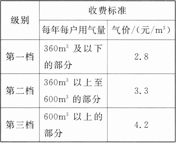 9. 某市民用天然气气价根据每年每户用气量分为三个档次,具体收费标准如下表: