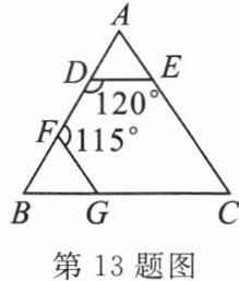 13.(湖南省中考改编)如图,在$\triangle ABC$中,若$DE// BC$,$FG// AC$,$\angle BDE = 120^{\circ}$,$\angle DFG = 115^{\circ}$,则$\angle C$的度数为
