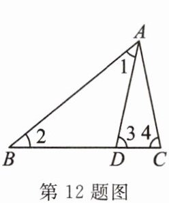 12.【原创题】如图所示,在△ABC 中,D 是 BC 边上一点,∠1 = ∠2,∠3 = ∠4,∠BAC = 63°,则∠DAC =