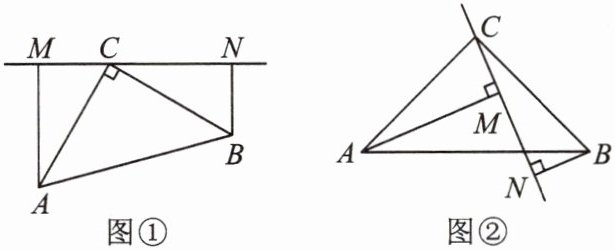 (2)如图②,若过点$C作直线MN与线段AB$相交,$AM\perp MN于点M$,$BN\perp MN于点N$($AM>BN$),(1)中的结论是否仍然成立?若不成立,请写出正确的结论,并说明理由。